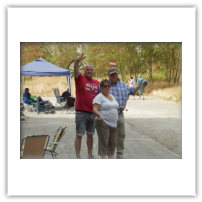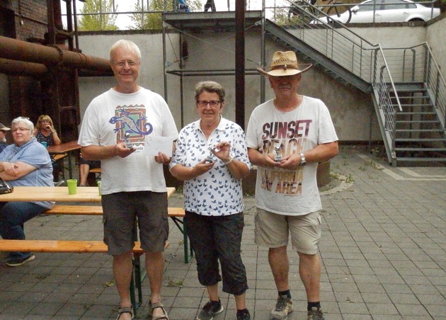 So sehen Sieger aus: Friedhelm Meiss, Bärbel Brinkel und Itze Schürmann. Neben dem Wanderpokal erhielten sie als Andenken auch noch einen Pokal für ihre Trophäensammlung. Sie wurden von unserem Grillmeister Martin in liebevoller Kleinstarbeit hergestellt.