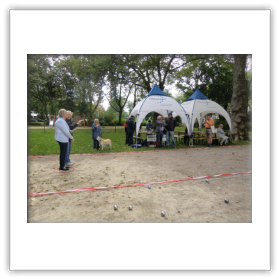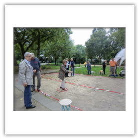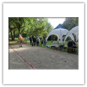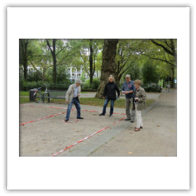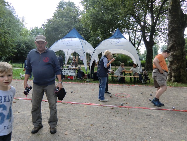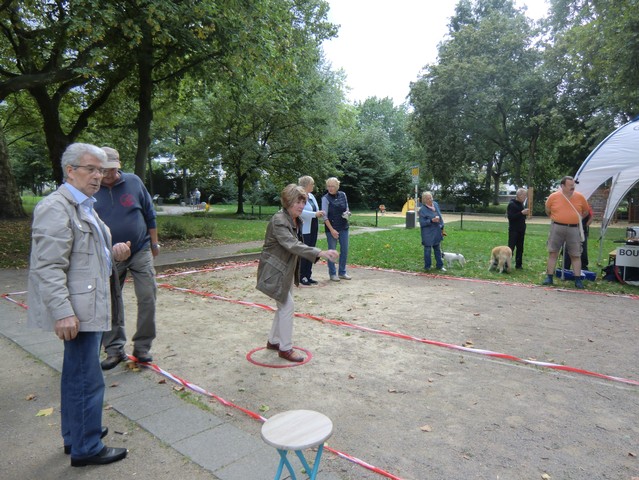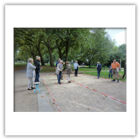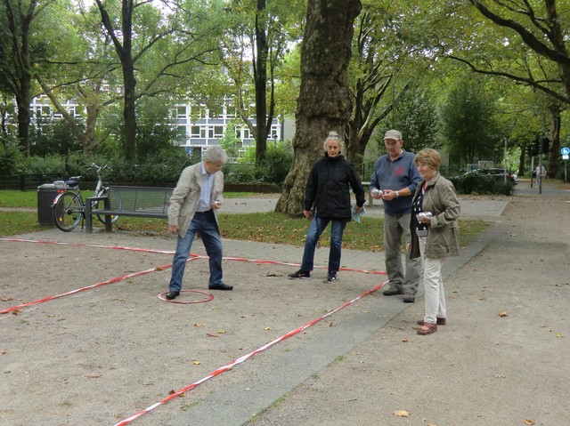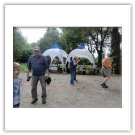 Die Regeln für das Boulespiel, auch Petanque genannt, konnten dann alle Interessierten während des Spielens kennenlernen, schwierig war das nicht. Aus einem auf dem Boden hergerichteten Kreis wird eine kleine Holzkugel, Schweinchen (oder auch Sau) genannt auf 6 bis 10 Meter Entfernung geworfen. Die Mannschaften müssen nun versuchen, so viele Kugeln wie möglich näher an das Schweinchen zu werfen bzw. zu rollen als die gegnerische Mannschaft. Die Anzahl der "besseren Kugeln" ergibt die Anzahl der Punkte für das jeweilige Team. Sobald eine Mannschaft 13 Punkte zusammen hat ist das Spiel beendet. Dann ist es eine Gepflogenheit, sich mit dem Sieger zum Zeichen des Glückwunsches abzuklatschen.