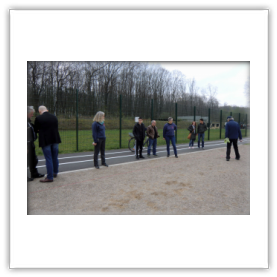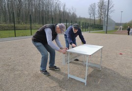 Gegen Samstagmittag waren schon die ersten fleißígen Helfer des Boules Club Buer dabei einen Stand mit Boulekugeln und Zubehör auf dem für das Boulespiel vorgesehenen Platz aufzubauen. Bernhard und Hille hatten ihren ganzen Kofferraum vollgepackt um möglichst viele interessierte Bürger mit Leihkugeln versorgen zu können. Mit Nägel, Hammer und Schnüren bewaffnet wurden durch Bernhard und Wolfgang auch schnell 2 Spielbahnen abgeteilt. Um 13 Uhr war die Übergabe der Freizeitanlage Westerholt an der Kuhstraße durch Bürgermeister Fred Toplak an die Öffentlichkeit angedacht. Danach war ein Rundgang mit den Besuchern der Nachbarschaft geplant -